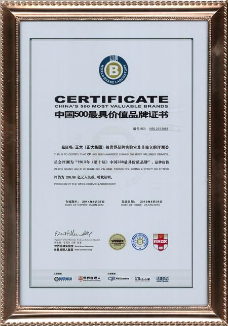 正大集團榮膺“中國500***具價值品牌”