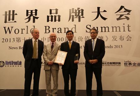 6月26日,由世界品牌實驗室、世界經(jīng)理人雜志等機構主辦的世界品牌大會暨2013年第十屆《中國500***具價值品牌》發(fā)布會在北京東方君悅大酒店召開。會議發(fā)布了2013第十屆《中國500***具價值品牌》排行榜,正大集團以208.86億元的品牌價值位居第88位。美國耶魯大學管理學院萊維·多爾教授(右一)、法國歐洲工商管理學院瓊·克勞德·拉里齊教授(左二)以及英國牛津大學商學院斯蒂芬·沃格教授(左一)為正大集團頒獎。董事長辦公室(北京)楊海浩總裁(右二)代表集團接受獎杯及證書。
